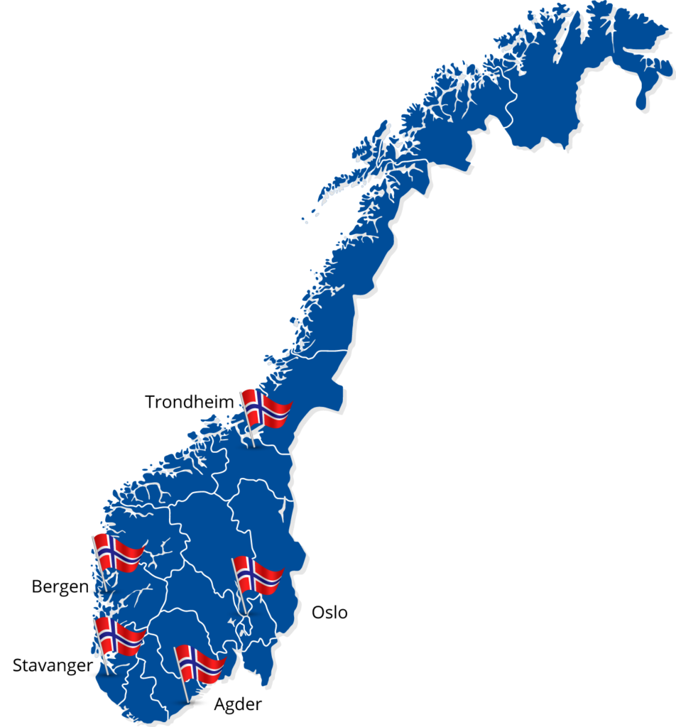 Vi har lager i Agder, Stavanger, Bergen og Trondheim