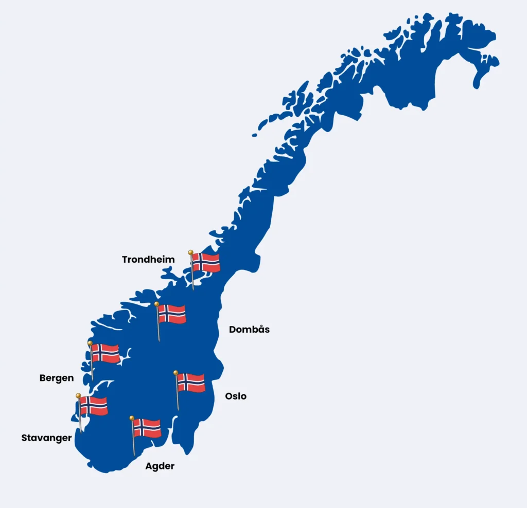 Vi har lager i Agder, Stavanger, Bergen, Dombås og Trondheim